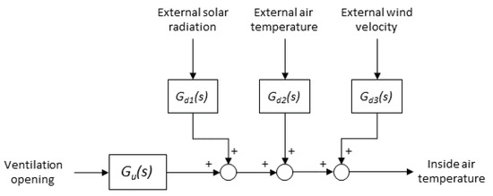 Now, the high-order ARX model described in the previous section is reduced to low-order models to facilitate the control design stage. As a result, four different low-order models will be obtained such as shown in Figure 9. On the one hand, the relationship between the natural ventilation and the inside air temperature of the greenhouse is given by the process transfer function, . On the other hand, three additional transfer functions, , are obtained for each of the disturbances.