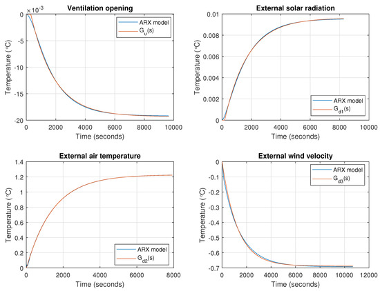 The procedure to reduce the high-order ARX model consists in utilizing an unit step signal as input for the ventilation opening while the disturbances are set to zero. Then, the transient response for the inside air temperature predicted by the ARX model is analyzed applying the reaction curve method to calculate the characteristic parameters of a transfer function. The same actions are applicable to find a model for a measurable disturbance, in this case, the unit step signal is for one of the disturbances while setting to zero the ventilation opening and the remaining disturbances. The structure for the transfer functions was imposed as a first-order model with or without dead time, depending on the different transient responses. This procedure was smoothly accomplished with the System Identification Toolbox™ in MATLAB®. In Figure 10, a graphical comparison is presented to confirm that the transfer function models accurately capture the dynamics predicted by the ARX model.