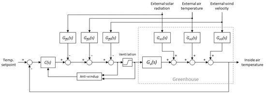 The proposed control strategy in this work is a combination of a PI controller with feedforward compensators. The implementation scheme can be observed in Figure 11. This control scheme tackles the problem of temperature control for a greenhouse in a simple way, but taking into account the particularities mentioned in Section 2.3 regarding the presence of disturbances and the limitations of the actuators for natural ventilation.