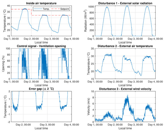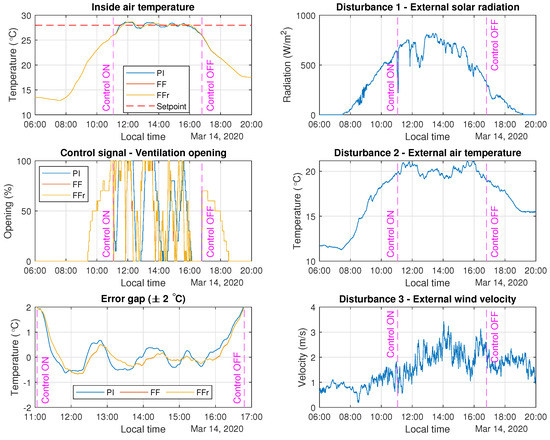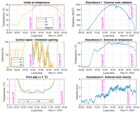 Figure 15 shows the best control results corresponding to day 2 in detail. The inside air temperature is correctly controlled at the desired setpoint, with no significant deviations. In this day, all the FF compensators were active and, thus, the control signal for the ventilation opening is visibly varying. All the disturbances seem to be well rejected by the FF compensators on this windy day with an external air temperature that was not as stable as compared to day 1 and 3.