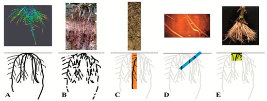 Summary of root system architecture captured by various methods: (A) full root phenotype, (B) trenching, (C), coring, (D) mini-rhizotrons, (E) crown root excavation. Black outlining of the root system indicates regions that could be viewed for phenotyping. Colored bars indicate the region of sampling. The figure is reproduced with permission from Topp et al. [6].