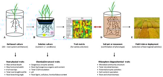 Summary of proposed trait-based phenotyping pipeline for crop improvement: 3D RSA in agar (A); solution culture for organic acid production in root tips, exported organic acids (OA), exported enzymes (E), root composition, protons for acidification (H+), and structural composition of roots/shoots (B); trait matrix used for resource-specific phenotype selection (C); pots/mesocosm controlled environment experiments for the verification of root phenotype and characterization of rhizosphere biogeochemical traits (D), which are added to the trait matrix and used to finally make a selection for field trials or deployment (E).