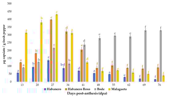 Evolution of total capsiate content (µg g−1 of FW) during the development of pepper fruits (n = 2). According to the Tuckey’s test, results with a p-value less than 0.05 were considered to be statistically different. Taking this into account, the use of different letters in this figure indicates that there is a significant difference between results depending on Tuckey’s test. In turn, the letters of each color refer to their respective variety, that would be from left-to-right, blue for ‘Habanero’, orange for ‘Habanero Roxo’, grey for ‘Bode’, and yellow for ‘Malagueta’.
