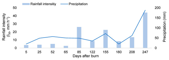 Temporal precipitation (mm) and maximum rainfall intensity (I30, mm h−1) in the period between 5 and 247 days after pile burning.