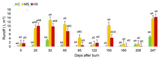 Treatment effect under control (C), moderate severity (MS), and high severity (HS) burn on runoff (L m−2) between 5 and 247 days after pile burning. Mean values followed by the different lowercase letters show significant differences within the same date. Mean values followed by the different uppercase letters show statistically significant differences within the same treatment. Significant differences were observed at p < 0.05. Hanging bars represent the standard error (n = 5).