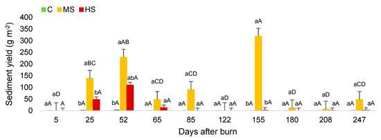 Treatment effect under control (C), moderate severity (MS), and high severity (HS) burn on sediment yield (g m−2) between 5 and 247 days after pile burning. Mean values followed by the different lowercase letters show significant differences within the same date. Mean values followed by the different uppercase letters show significantly different within the same treatment. Significant differences were observed at p < 0.05. Hanging bars represent the standard error (n = 5).