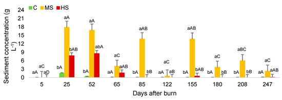 Treatment effect under control (C), moderate severity (MS), and high severity (HS) burn on sediment concentration (g L−1) between 5 and 247 days after pile burning. Mean values followed by the different lowercase letters show significant differences within the same date. Mean values followed by the different uppercase letters show significantly different within the same treatment. Significant differences were observed at p < 0.05. Hanging bars represent the standard error (n = 5).