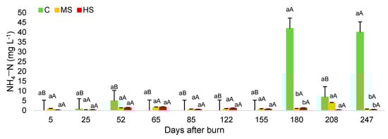 Treatment effect under control (C), moderate severity (MS), and high severity (HS) burn on ammonium (NH4-N) (mg L−1) concentration between 5 and 247 days after pile burning. Mean values followed by the different lowercase letters show significant differences within the same date. Mean values followed by the different uppercase letters show statistically significant differences within the same treatment. Significant differences were observed at p < 0.05. Hanging bars represent the standard error (n = 5).
