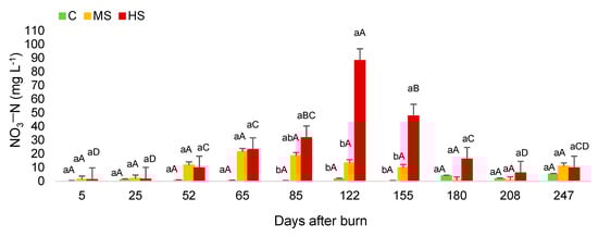 Treatment effect under control (C), moderate severity (MS), and high severity (HS) burn on nitrate (NO3-N) (mg L−1) concentration between 5 and 247 days after pile burning. Mean values followed by the different lowercase letters show significant differences within the same date. Mean values followed by the different uppercase letters show statistically significant differences within the same treatment. Significant differences were observed at p < 0.05. Hanging bars represent the standard error (n = 5).
