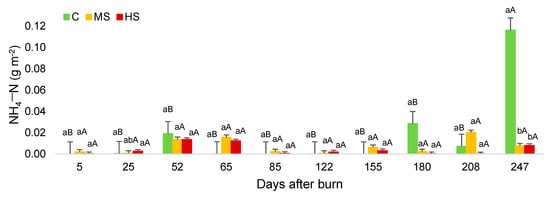 Treatment effect under control (C), moderate severity (MS), and high severity (HS) burn on NH4-N loss between 5 and 247 days after pile burning. Mean values followed by the different lowercase letters show statistically significant differences within the same date. Mean values followed by the different uppercase letters show statistically significant differences within the same treatment. Significant differences were observed at p < 0.05. Hanging bars represent the standard error (n = 5).