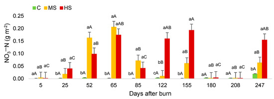Treatment effect under control (C), moderate severity (MS), and high severity (HS) burn on NO3-N loss between 5 and 247 days after pile burning. Mean values followed by the different lowercase letters show statistically significant differences within the same date. Mean values followed by the different uppercase letters are statistically significant differences within the same treatment. Significant differences were observed at p < 0.05. Hanging bars represent the standard error (n = 5).