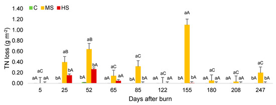 Treatment effect under control (C), moderate severity (MS), and high severity (HS) burn on total Nitrogen (TN) loss between 5 and 247 days after pile burning. Mean values followed by the different lowercase letters show statistically significant differences within the same date. Mean values followed by the different uppercase letters show statistically significant differences within the same treatment. Significant differences were observed at p < 0.05. Hanging bars represent the standard error (n = 5).