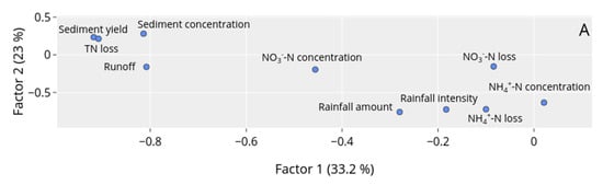 Factor 1 had high negative loadings in sediment yield, TN loss, sediment concentration, and runoff. Factor 2 had high negative loadings in rainfall amount, rain intensity, NH4-N loss, and concentration. Finally, Factor 3 had positive loadings in NO3-N concentration and loss. The intersection between Factor 1 and Factor 2 shows that sediment yield, TN loss, sediment concentration, and runoff are inversely related to most other variables, especially to rainfall amount and intensity (Figure 10A). The impact of all treatments is noticeably different. The variability is noted in all treatments, although MS can be singled out as the most variable (Figure 10B).