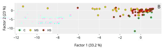 The relation between Factors 1 and 2, (A) Variables, and (B) Cases. TN, total nitrogen; C, control; MS, moderate severity; HS, high severity.