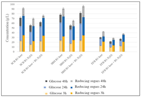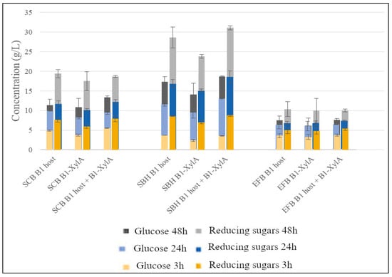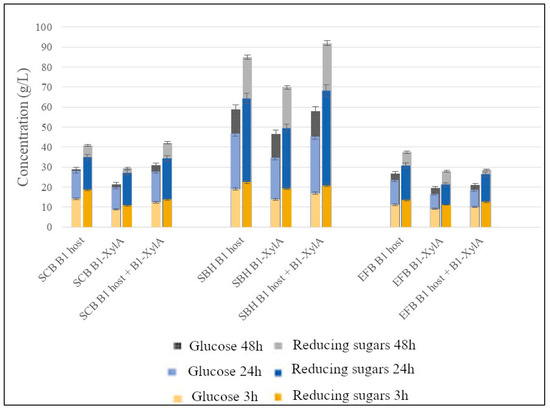 Untreated samples of SCB released between 17 and 19 g/L of reducing sugars, between 11 and 13 g/L of glucose and nearly 2 g/L of xylose after 48 h; fructose was not detected. The ratio between glucose and xylose was around 6, and there was not a significant difference between enzyme preparations. Untreated SBH released, after 48 h, an average of 31 g/L of reducing sugars using B1 host + B1-XylA and around 29 g/L using B1 host, without significant difference between these enzyme combinations. Glucose concentration, however, was higher with B1 host + B1-XylA (almost 19 g/L). Small amounts of xylose and fructose (3–4 g/L of xylose, 2–3 g/L of fructose) were determined with little advantage of B1 host + B1-XylA. Untreated EFB released 10 g/L of reducing sugars and around 7.5 g/L of glucose after 48 h, using B1 host and B1 host + B1-XylA; when B1-XylA alone was used, the glucose concentration after 48 h was 6 g/L. Xylose concentration was of about 3 g/L for all enzyme combinations and no fructose was detected.