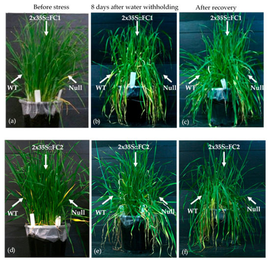 This drying curve was previously determined to represent the relationship between predawn leaf water potential, pot weight, and the particular soil characteristics used in this experiment. We first made qualitative observations on the relative time to wilting. Visual inspection revealed controls reversibly wilted at −0.6 MPa soil water potential (8 days post water-withholding), whereas neither HvFC1 nor HvFC2 overexpressing transgenics exhibited wilting symptoms. This can be seen in Figure 3 in the day 8 image (b,e), where the representative transgenic line for either HvFC1 or HvFC2 at the rear of the pot remain erect, while those at the front were wilted (untransformed controls (WT) and null segregants).
