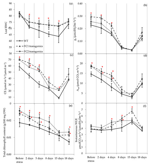 Water and CO2 are essential substrates for photosynthesis. Therefore, we investigated whether the observed positive water status and enhanced gs in HvFC transgenics has the capacity to improve photosynthesis. Measurements of CE revealed that both HvFC1 and HvFC2 transgenics had a significantly higher photosynthetic capacity, relative to wild-type controls, before and during the early phases (2–5 days post water-withholding) of drought stress, and even after 1 week, at −0.6 MPa soil water potential (15 days post water-withholding) (Figure 4c). This finding extended to the photosynthesis rate under saturated light, whereby both HvFC1 and HvFC2 transgenics showed a significantly higher Asat, before and 2 to 5 days post water-withholding, relative to the controls (Figure 4d). The improvement in Asat was between 3 and 4 µmol m−2s−1 in both transgenics, relative to wild-type (Figure 4d).