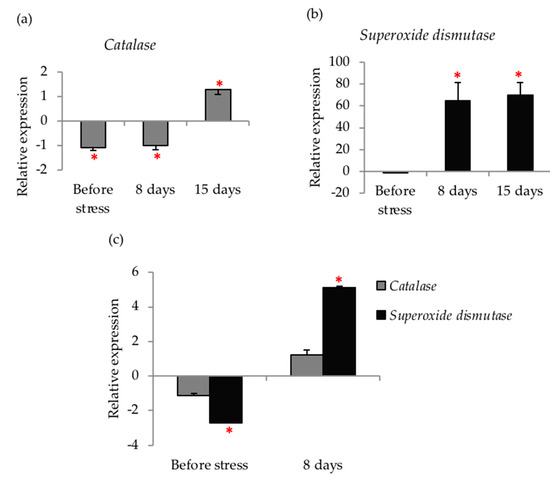 Transcriptional responses of ROS detoxification enzymes, catalase, and superoxide dismutase, in a representative transgenic line, each ectopically overexpressing HvFC1 (a,b) or HvFC2 (c) under drought stress, relative to WT control. The data are shown as mean ± standard error (SE) of 3 different plants. Asterisks indicate statistically significant expression difference between transgenics and WT control, at * p < 0.05, based on two-way ANOVA.