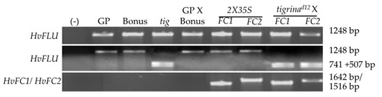 Under stress, plants also undergo oxidative stress, generated by photo-sensitizing tetrapyrrole intermediate accumulation [44,45]. In order to investigate whether ectopic overexpression of HvFCs contribute to tetrapyrrole-induced oxidative stress tolerance, we used the tigrinad12 mutant. In tigrinad12, tetrapyrrole biosynthesis is deregulated and consequently these plants accumulate the highly photo-sensitizing chlorophyll branch intermediate, Pchlide, under darkness. Etiolated mutant seedlings display strong red fluorescence at 655 nm through UV excitation, due to Pchlide accumulation [39]. When these plants are re-exposed to light, photosensitizing Pchlide generates 1O2 and causes extensive photo-oxidative damage [39]. A representative transgenic line for HvFC1 and HvFC2 was crossed with tigrinad12. Homozygous tigrinad12 plants were detected within a segregating F2 population, using a CAPS marker, designed to the causative mutation in the FLU gene [39] (Figure 6, 1st and 2nd panel). Lines containing HvFC transgenes were additionally identified by using a dominant transgene specific PCR marker (Figure 6, 3rd panel).