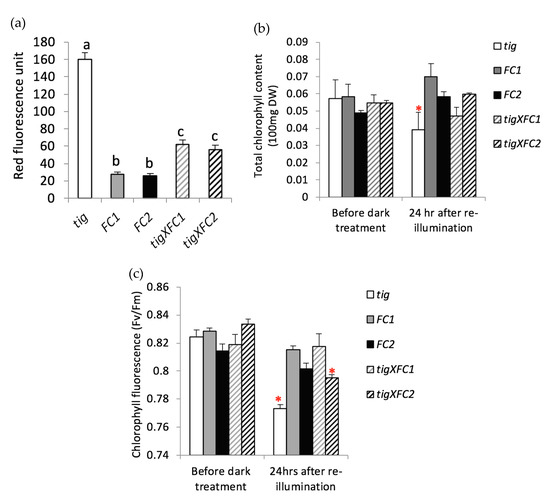Potential photo-toxic effects were evaluated in these plants, upon re-exposure to light, by analyzing the total chlorophyll content and the chlorophyll fluorescence parameter Fv/Fm. Total chlorophyll content was significantly reduced (p < 0.05) in tigrinad12 mutants, 24 h post re-illumination (Figure 7b). However, the chlorophyll content remained unchanged in transgenic tigrinad12 overexpressing either HvFC1 or HvFC2, suggesting that overexpression of HvFCs suppress the potential photo-bleaching effects of tigrinad12. Similarly, tigrinad12 exhibited a significant reduction in chlorophyll fluorescence, 24 h after re-illumination (Figure 7c). Such an effect was not observed in the tigrinad12 overexpressing HvFC1. In the tigrinad12 overexpressing HvFC2, Fv/Fm was reduced 24 h after re-illumination, relative to the before-dark treatment, but it was not as strong as tigrinad12. Taken together, these results indicate that both HvFC1 and HvFC2 have the capacity to suppress the photo-toxic effects caused by tetrapyrrole deregulation in tigrinad12.