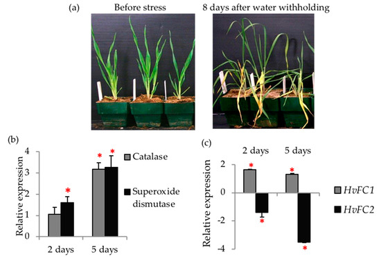 Control plants wilted 8 days post water-withholding (Figure 8a). Cat expression was significantly upregulated 5 days post water-withholding, relative to the well-watered plants (Figure 8b). Transcript levels of Sod was also significantly increased 2 to 5 days post water-withholding (Figure 8b). In-line with previous studies [16,20,21,29,30,31,32,33,34], HvFC1 was significantly upregulated, whereas HvFC2 was downregulated, 2 to 5 days post water-withholding, relative to the well-watered plants (Figure 8c).