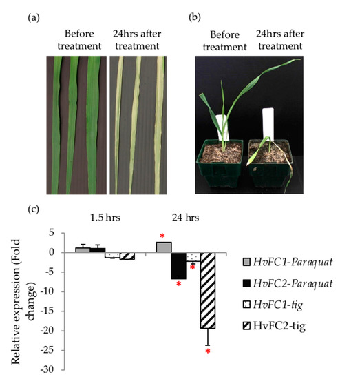 Phenotypes of control barley leaves and HvFC transcript abundance upon exposure to Paraquat-induced and tetrapyrrole-mediated oxidative stress. Leaves of control plants before and 24 h after exposure to (a) Paraquat-induced oxidative stress, and (b) tetrapyrrole-mediated oxidative stress in tigrinad12 mutants. (c) Relative expression of HvFC1 and HvFC2, upon oxidative stress relative to before stress. The data are shown as mean ± standard error (SE) of 3 different plants. Asterisks indicate a statistically significant expression difference, relative to before treatment, at * p < 0.05 using one-way ANOVA.