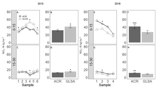 Average soil nitrate (NO3−-N) in 2015 from fields with annual crop rotations (ACR) and following a 3-year grassland set-aside (GLSA) at the 0–15 cm depth by sampling time (A) and seasonal average (B) and at the 15–30 cm depth by sampling time (C) and seasonal average (D); average soil nitrate (NO3−-N) in 2016 from fields with ACR and following a 3-year GLSA at the 0–15 cm depth by sampling time (E) and seasonal average (F) and at the 15–30 cm depth by sampling time (G) and seasonal average (H). Error bars represent one standard error of the mean (n = 4). Significant differences are indicated by * (p < 0.05), ** (p < 0.01), and *** (p < 0.001).