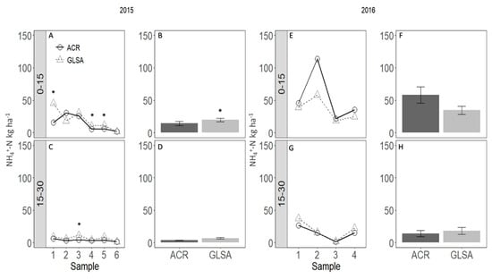 The timing of NH4+-N supply during the 2015 season followed a similar trend to NO3−-N. At sampling times one, four, and five, NH4+-N at the 0–15 cm depth was significantly higher (p < 0.05) in GLSA than in ACR (Figure 2A), and the overall seasonal average NH4+-N was 20% higher (p < 0.01) in GLSAs than in ACR fields (Figure 2B). At the 15–30 cm depth, NH4+-N was only significantly higher in GLSA at sampling time three (Figure 2C) and the overall seasonal average NH4+-N was not significantly different between GLSA and ACR (Figure 2D). In 2016, there were no significant differences in NH4+-N either by sampling time or overall average at either depth (Figure 2E–H).