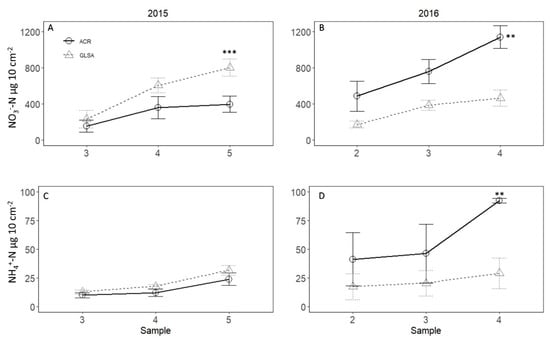 In the 2015 growing season (that was warmer and drier than typical), cumulative NO3−-N was not significantly different until sampling time five (p < 0.001) when GLSA supplied 67% more NO3−-N than ACR (Figure 3A). In contrast, during the 2016 growing season (that was warmer and wetter than typical), ACR sites supplied 80% (p < 0.01) more NO3−-N by the end of the season (Figure 3B). There were no significant differences observed in cumulative NH4+-N during the 2015 season, while by the end of the 2016 season the ACR supplied three times as much NH4+-N (p < 0.01) than the GLSA (Figure 3C,D).