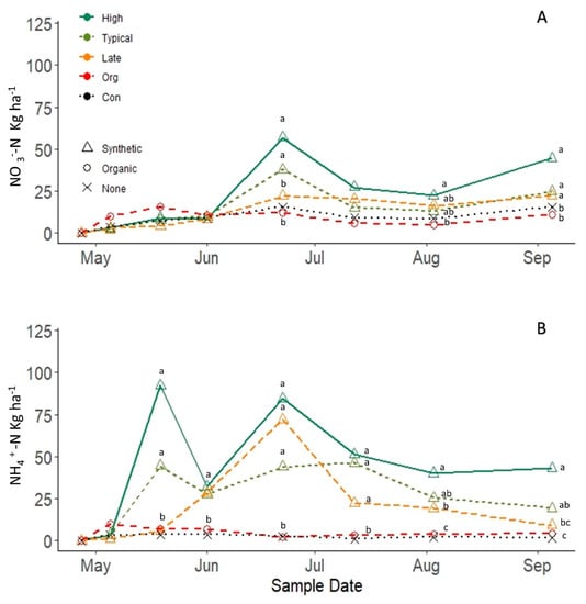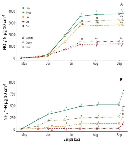 Since High, Typical and Late treatments all received NH4-based fertilizer, it is not surprising that the peak of NH4+-N was observed earlier in the growing season than NO3−-N (Figure 4B). In samples taken on May 18th (21 DAI), the NH4+-N supply of High and Typical treatments was 25 and 11 times greater, respectively, relative to the Control and differed significantly (p < 0.05) from all other treatments but not from one another. By 1st June (35 DAI), the NH4+-N in the High and Typical treatments dropped substantially, while the Late treatment increased to match levels in High and Typical treatments, all three then supplying close to ten times more (p < 0.05) NH4+-N than the Control and four times as much as Organic treatments.