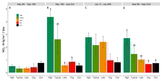 Potentially mineralizable nitrogen for High fertilizer (High), Typical fertilizer (Typical), Late incorporation (Late), Organic and control shown as mineralized (NO3−-N) during 5th May to 9th May (A); 19th May to 2nd June (B); from 12th July to 26th July (C); and from 9th September to 23rd September (D) incubation periods. Different letters indicate significant differences (p < 0.05).