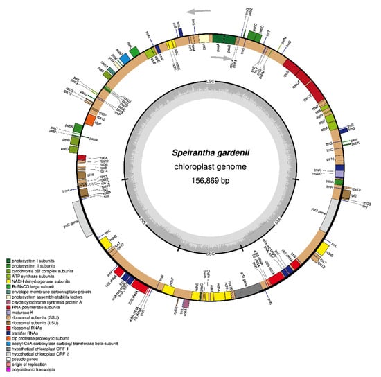 A high-quality Speirantha gardenii DNA sample was obtained from the DNA bank of the Royal Botanic Gardens, Kew, London, England (http://data.kew.org/dnabank/DnaBankForm.html). Whole-genome sequencing was performed using Illumina HiSeq2500 (Phyzen Ltd., South Korea) and a paired-end (PE) library of 2 × 150 bp and an insert size of ~550 bp and obtained 8,363,058,594 raw reads. Read quality was analyzed with FastQC [51] and low-quality reads were removed with Trimmomatic 0.39 [52]. The clean reads were filtered with GetOrganelle pipe-line (https://github.com/Kinggerm/GetOrganelle) to get plastid-like reads, then the filtered reads were assembled by de nova approach using SPAdes version 3.12.0 [53]. The obtained contigs (>500 bp) were mapped with Nicotiana tabacum plastid genes (NC_001879) and three putative plastid-like contigs were identified and scaffolded using Geneious Prime (Biomatters, New Zealand). complete chloroplast genome sequence and gene annotation were submitted to GenBank and assigned the accession number MT797212.