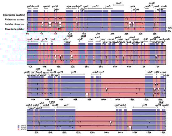 Sequence alignment of four Nolinoideae chloroplast genomes performed using the mVISTA program with Speirantha gardenii as a reference. The top grey arrow shows genes in order (transcriptional direction) and the position of each gene. A 70% cut-off was used for the plots. The y-axis indicates a percent identity of between 50% and 100%, and the red and blue areas indicate intergenic and genic regions, respectively.