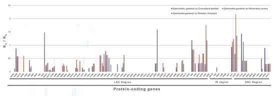 Synonymous and nonsynonymous substitution rates are analyzed for 79 protein-coding genes of S. gardenii, R. carnea, R. chinensis and C. keiskei chloroplast genomes (Figure 4). The KA/KS ratio of most of the genes are less than 1, except ccsA (1.13–1.43), infA (1.19), ndhF (1.36–2.15), rpl20 (1.59), rps2 (1.48), rps3 (1.18–1.76) and ycf1 (1.13–1.23) protein-coding genes.