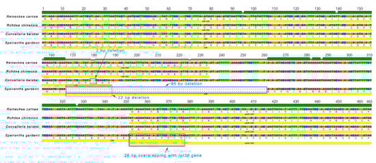 The translation factor IF-1 (infA) gene of S. gardenii is compared with the other three Nolinoideae species. The comparative analysis showed that 26 bp deleted at the 3’ end of the infA gene followed by 79 bp deletion in the intergenic region between infA and rpl36 gene in the chloroplast genome of S. gardenii. Due to this frameshift mutation, the 3’ end of the infA is extended and 26 bp overlaps with the rpl36 gene, thus leads to the length of the infA gene increased to 282 bp (Figure 5).
