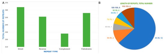 REPuter program is used to determine the presence of repeat sequences in the S. gardenii chloroplast genome. The analysis showed that a total of 699 repeats, with motif length from 30 to 115 bp are present in its genome. The repeats sequences included 264 direct, 251 reverse, 228 complementary and 256 palindromic repeats (Figure 6a). Of these repeats, 30–39 bp long repeats predominantly occupy in the chloroplast genome and account for 98.1% (680 repeats) (data not shown). The remaining 19 repeats are distributed in the range of 40 to 115 bp length (Figure 6b).
