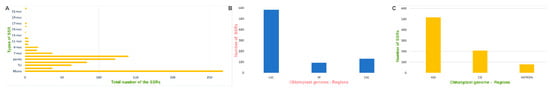 The presence of simple sequence repeats (SSRs) in the Speirantha gardenii chloroplast genome. (A) Distribution of different types of SSRs; (B) Presence of SSRs in the LSC, SSC, and IR regions; (C) Presence of SSRs in intergenic spacers, protein-coding regions, and intron regions.