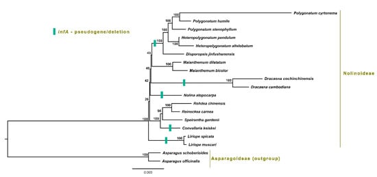 Furthermore, the high sequence variation is identified in the chloroplast genomes of Nolinoideae species. When S. gardenii is compared with other closely related species, the minor divergence is identified in the intergenic regions of the R. carnea chloroplast genome. Besides, high sequence variation is identified in the intergenic regions of C. keiskei and intergenic and protein-coding regions of R. chinensis. This sequence variation is due to the insertion of the mitochondrial region in the chloroplast genome of C. keiskei and indel observed in the intergenic and protein-coding regions of R. chinensis genome. Owing to the indel events in the Nolinoideae species, the substitution rate impacts in some protein-coding genes. The rate of synonymous substitutions (KS) accumulates nearly neutral evolution, whereas the rate of nonsynonymous substitutions (KA) are subjected to selective pressures of varying degree and positive or negative direction [20]. The ratio of KA/KS (ω) value below 1 indicates that the corresponding genes experiencing relaxed or purifying selection while ω = 1 and ω > 1 indicate neutral and positive selection, respectively [20,21]. The KA/KS ratio of the protein-coding genes, such as ccsA, infA, ndhF, rpl20, rps2, rps3 and ycf1, are more than 1, which indicates that these genes are under positive selection (Figure 4). This deviation from unity is due to the presence of indel, premature stop codon and amino-acid substitution events in the protein-coding genes, such as the 6 bp deletion and three amino-acid change in the ccsA and infA of C. keiskei; 6 and 5 amino acid change by non-synonymous substitution in the ndhF gene of R. carnea and R. chinensis; 8 bp insertion and 2 amino-acid substitution in the rpl20 and rps2 of R. chinensis; 3 amino acid change in the rps3 of R. carnea; 18 amino-acid change and 161 bp insertion in the ycf1 gene of R. carnea and R. chinensis. Though we have identified high KA/KS nucleotide substitution ratio in these protein-coding genes, the overall nucleotide identity is >99.2%, except for infA (85%). So, we compared the infA gene in the Nolinoideae subfamily. Usually, the length of the infA gene is 234 bp. Most of the species of the Nolinoideae subfamily do not contain an infA gene or contain it as a pseudogene except Maianthemum dilatatum, M. bicolor, R. carnea and R. chinensis [9,10,13]. Meanwhile, the deletion of two bp at the 180th bp position in the infA gene of C. keiskei, causes frameshift mutation to a premature stop codon and thus leads to the formation of infA pseudogene [12]. In contrast, a total of 95 bp deletion occurred at the 3’ end of the infA gene (26 bp) and the intergenic region between the infA and rpl36 gene (79 bp). Due to the indel process, a frameshift mutation occurred and the 3’ end of the infA is extended and 26 bp overlaps with the rpl36 gene, which thus led to the length of the infA gene increased to 282 bp (Figure 5). Furthermore, a similar type of elongated infA gene is observed in many monocot plants such as Zea mays, Oryza sativa, Hordeum vulgare etc. [22,23,24]. Besides, previous studies also revealed that most of the angiosperms have lost their infA gene independently in their chloroplast genome [25].