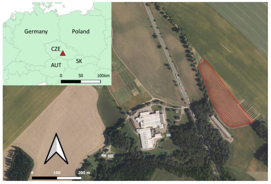 Localization of the Vatín experimental field station in CZE (Czech Republic) and European Union. The experimental plot from 2019 is marked with red hatching.
