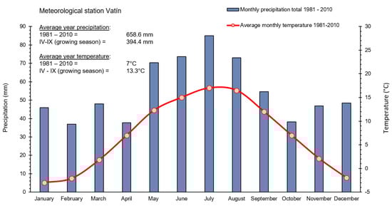 Weather conditions at the Vatín field experimental station—average monthly temperatures and mean annual precipitation amounts for long-term standard (1981–2010).