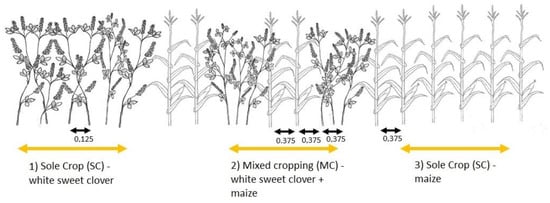 In 2019, a stand of the mixed cropping system was established by technology (Figure 3), which was developed from 2015. Examples of different technologies for establishing mixed cropping stands are presented in Appendix A, Figure A1 and Figure A2. The technology of mixed cropping was used to grow biomass for the preparation of various model silages with different shares (%w) of individual crops. The selected crops (Zea mays L., FAO 270 and Melilotus albus MED., Meba variety) were grown to obtain biomass for the preparation of shredding’s and model micro-silages utilizable in the laboratory biogas plant. The experimental plot was fertilized with DASA fertilizer (300 kg/ha) applied prior to the sowing. The DASA fertilizer (AGRO CS Ltd., Rikov, Czech Republic) is composed of 26% N (1/3 in the form of nitrate N and 2/3 in the form of ammonium N) and 13% S in the form of ammonium sulfate. This fertilizer dose provided enough nitrogen for maize nutrition and did not threaten the growth of the legume. Other nutrients (P, K, Mg and Ca) did not have to be applied with respect to the average supply of nutrients in the arable soil (Table 1). The system of stand organization and its individual variants is illustrated in Figure 3. Stand variants were divided into the following three groups: