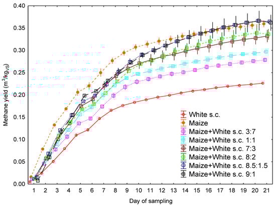 The scatter chart (Figure 5) shows the course of daily methane yield during 21 days of experiment. The course of values indicates that the pure White s.c. silage exhibited the lowest yield of methane already from the first measurement up to the end of the experiment. By contrast, the pure maize silage exhibited the highest biogas yield in the first 11 days of the experiment. In the following days of experiment duration, the difference in biogas yield between the maize silage and silage with the admixture of White s.c. up to 15%w (variants Maize + White s.c. 9:1 and 8.5:1.5) was diminishing. As mentioned above, the maize variant exhibited the demonstrably highest methane yield up to Day 11, which was also corroborated by the statistical analysis. On the other hand, the difference between this variant and variants supplemented with White s.c. silage (variants 9:1 and 8.5:1.5) was decreasing from Day 11 and from Day 13, as well as the difference between these variants plus the variant of Maize + White s.c. at 8:2.