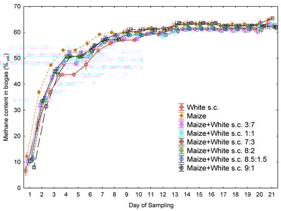 Figure 6 shows the course of methane concentration in biogas over 21 days. The course of the curves of individual variants shows similarity with the course of methane yield values (Figure 5), but the differences shown are less obvious. Maize silage without the addition of White s.c. exhibited the highest values of methane content in biogas up to 9 days of measurement. The differences between the silage monoculture and MC variants began to decrease significantly from Day 10 of the measurements. The only exception was the variant of White s.c. monoculture and the MC variant with the highest legume content, i.e., Maize + White s.c. 3:7. These two variants were exhibiting the lowest values of biogas content until the end of the experiment. The other MC variants showed a significant increase in the methane content of biogas from Day 10 of the measurements, and at the end of the experiment, the variants with the content of White s.c. up to 20%w reached similar values as the pure maize silage.