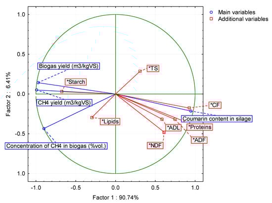 Part of the PCA analysis was also the calculation of the correlation matrix (Table 7), illustrating, in detail, relations among the individual parameters. It follows from the matrix that a strong dependence existed between the respective parameters—correlation. The correlation was of both negative and positive character. If we focus on the most important parameters of biogas yield and methane yield, we can see that they were negatively influenced by the content of coumarin in the silage; more precisely, the yield of these parameters was decreasing with its increasing content. Coumarin content was affected by the proportion of White s.c. in the silage, its concentration increasing with its increasing content (see Table 4). This significantly reflected in the biogas and methane yields, too, which were the lowest in variants with the highest content of White s.c. in the silage (Figure 5, Figure 6). The negative correlation between the biogas yield and the presence of CF in silage was at the same level as in the case of coumarin, where the CF content was decreasing with the decreasing presence of White s.c. in silage, and the yield of studied parameters (biogas and methane) was increasing.