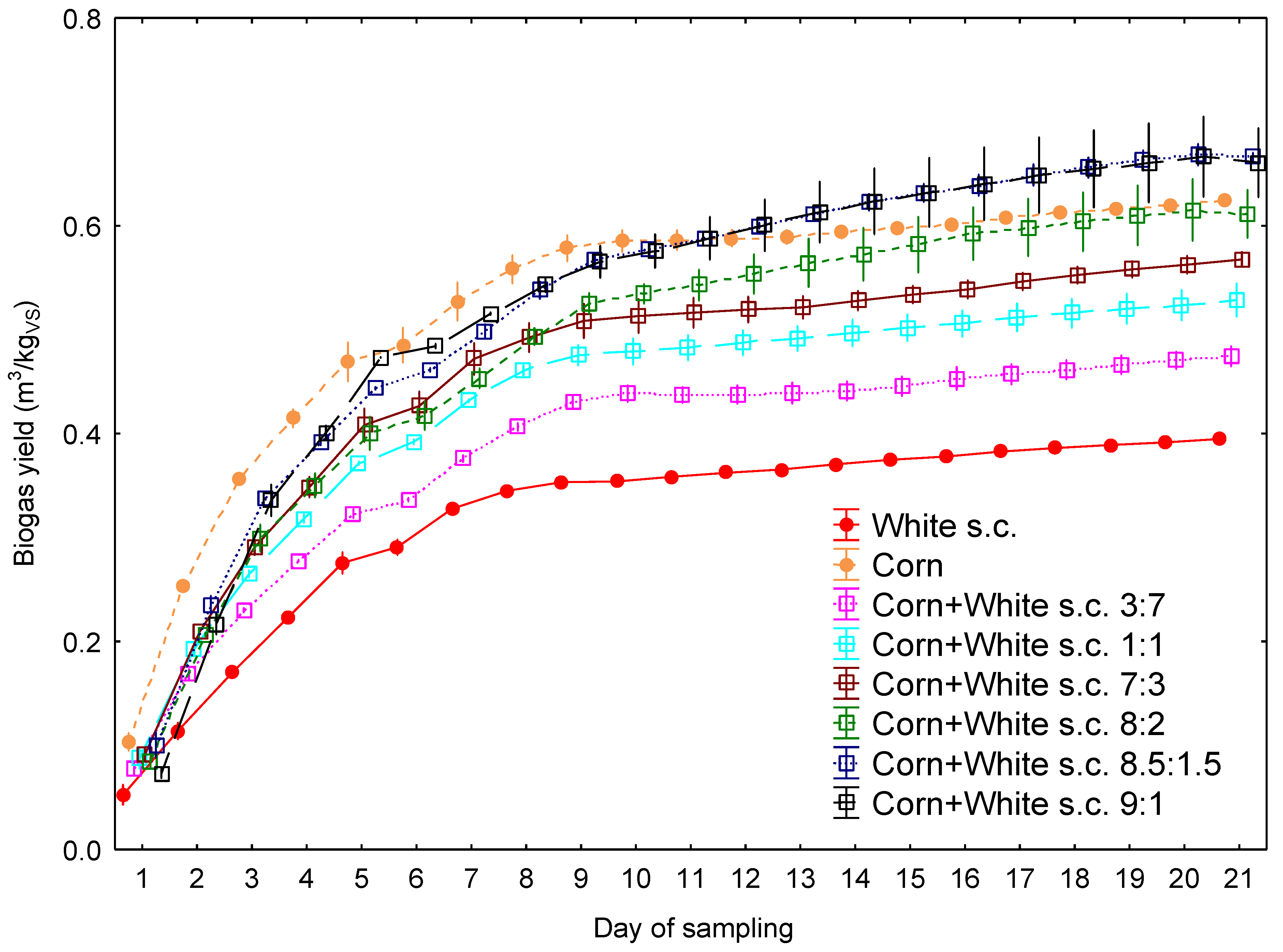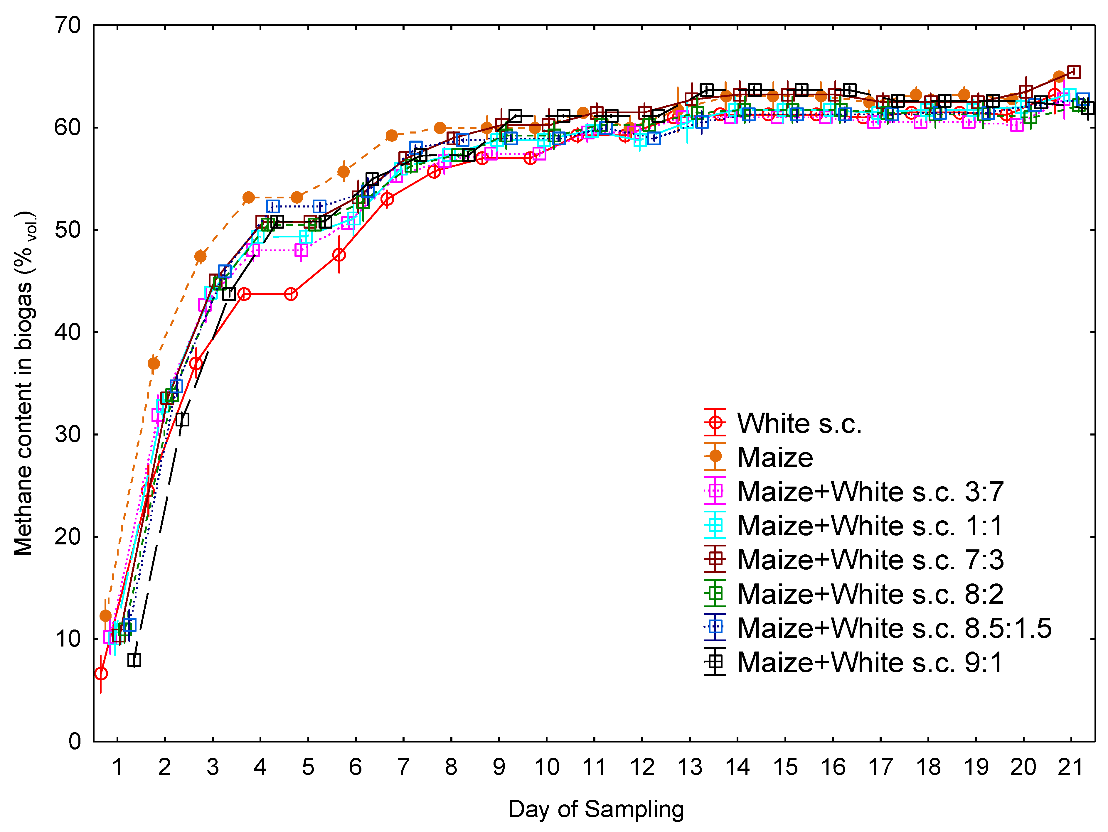 - The addition of legume to the maize silage affected the methane yield. The methane yield was significantly decreasing, with a increasing share of White s.c. in silage. The share of White s.c. up to 15%w in silage decreased the methane yield by 3% compared with the pure maize silage. The addition of 20–30% decreased the methane yield by 11% compared with the pure maize silage. Thus, the addition of up to 20% had presumably no significant influence on decreasing the methane yield.