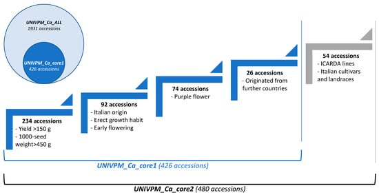 - Upadhyaya, H.D.; Bramel, P.J.; Singh, S. Development of a Chickpea Core Subset Using Geographic Distribution and Quantitative Traits. Crop. Sci. 2001, 41, 206–210. [Google Scholar] [CrossRef]