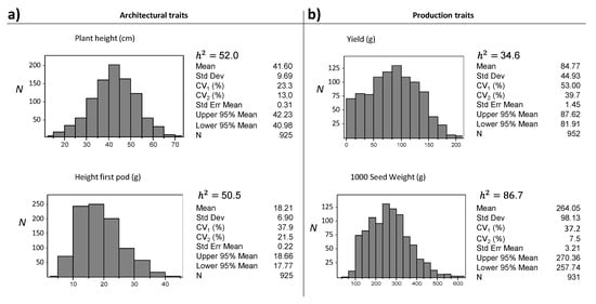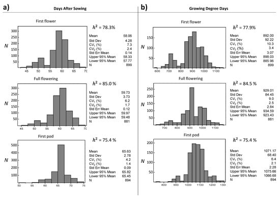 - Mallu, T.S.; Mwangi, S.G.; Nyende, A.B.; Ganga Rao, N.V.P.R.; Odeny, D.A.; Rathore, A.; Kumar, A. Assessment of genetic variation and heritability of agronomic traits in chickpea (Cicer arietinum L). Int. J. Agron. Agric. Res. 2015, 5, 76–88. [Google Scholar]