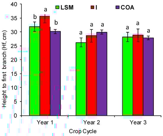 Height to first branch (Hf) of the celery crop, as a function of the fertilization treatment: local sheep manure (LSM), mineral (I), and commercial organic amendment (COA). “a” and “b” indicate significant differences between the three years of each treatment at the 95% confidence level.