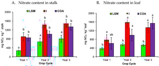 Figure 4A,B show the nitrate concentrations in the stalk and leaf, respectively of the celery plants at the time of harvest in the three crop cycles of the experiment. A low content of nitrate in the plants is very important for human health, due to its potential for transformation into nitrite, which is more likely to interact with hemoglobin and affect blood oxygen transportation [30]. The nitrate concentrations were significantly higher following the inorganic and COA treatments than with the LSM treatment. Many studies have found lower nitrate contents in organically fertilized crops, particularly leafy vegetables [29,60,61,62]. The nitrate concentration in a plant is the balance between the nitrate uptake and its metabolic reduction. Excessive commercial fertilizer or animal waste application, or its improper timing, can lead to excessive nitrate levels in the plants [31]. In addition, nitrate can combine with secondary amines to yield nitrosamines with carcinogenic effects [63].