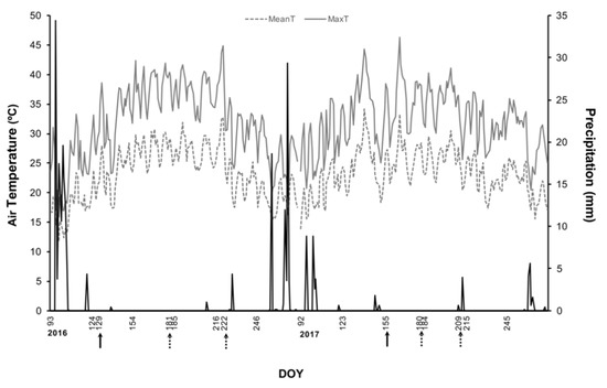 Daily mean temperature (Tmean, dashed grey line), maximum temperature (Tmax, grey line), and precipitation (black line) in 2016 and 2017. The filled arrows show the days of the kaolin application in 2016 (DOY 129) and 2017 (DOY155), and dashed arrows indicate the days of experimental measurements and material collection for prior analysis. DOY: day of the year.